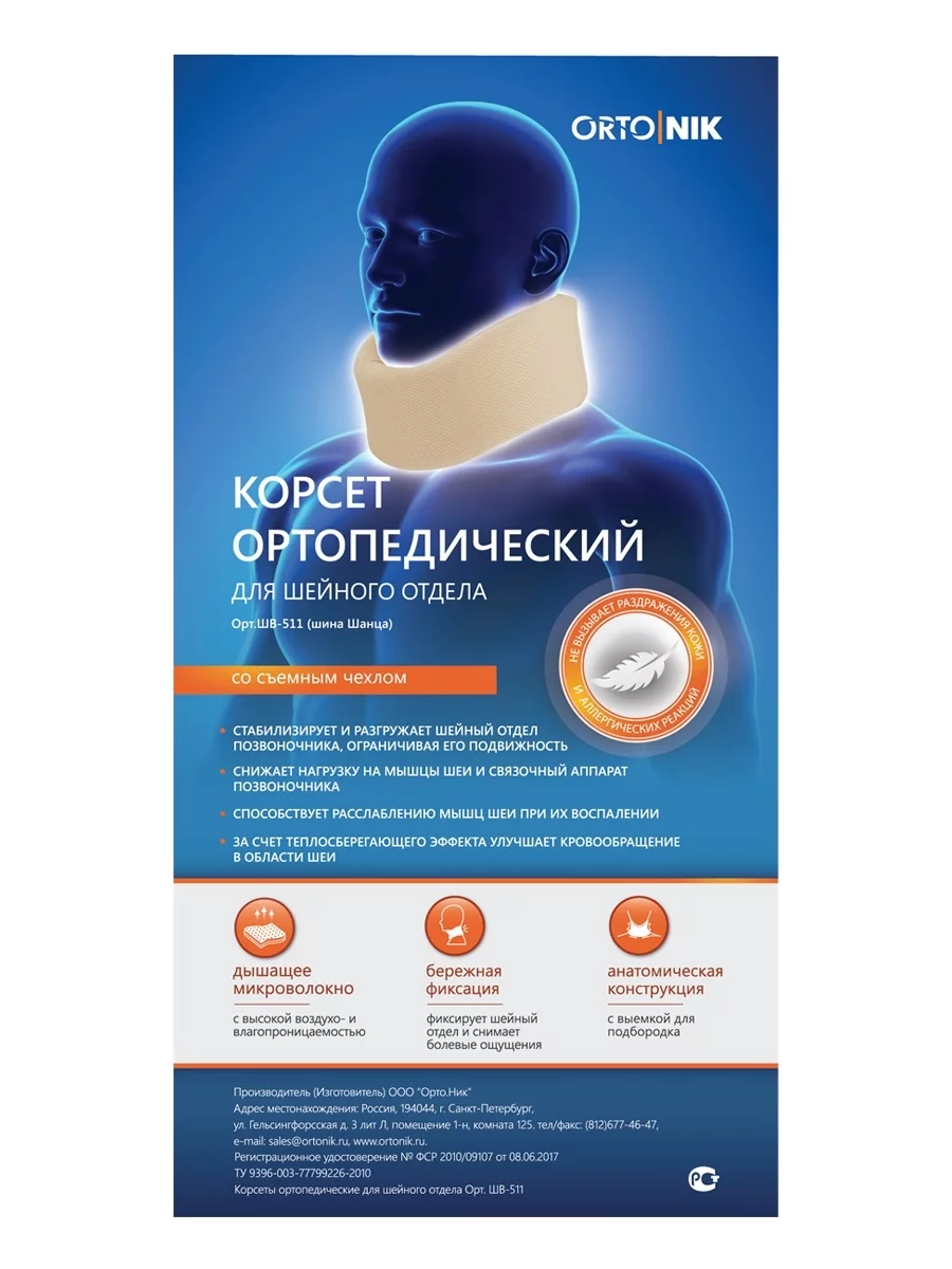 Шина-воротник (Шина Шанца) ШВ-511 — ортопедический корсет для шейного отдела позвоночника, применяемый с целью профилактики и лечения острых и хронических заболеваний шейного отдела позвоночника, а также снятие нагрузки и болевых ощущений с мышц и связок шеи. Воротник используют в комплексном лечении остеохондроза шейного отдела позвоночника ,а также хронических головных болей и головокружений, вызванных шейными спазмами. Благодаря анатомической конструкции с выемкой для подбородка воротник надежно фиксирует, стабилизирует и поддерживает шейный отдел позвоночника, тем самым корректируя его положение до физиологически правильного.