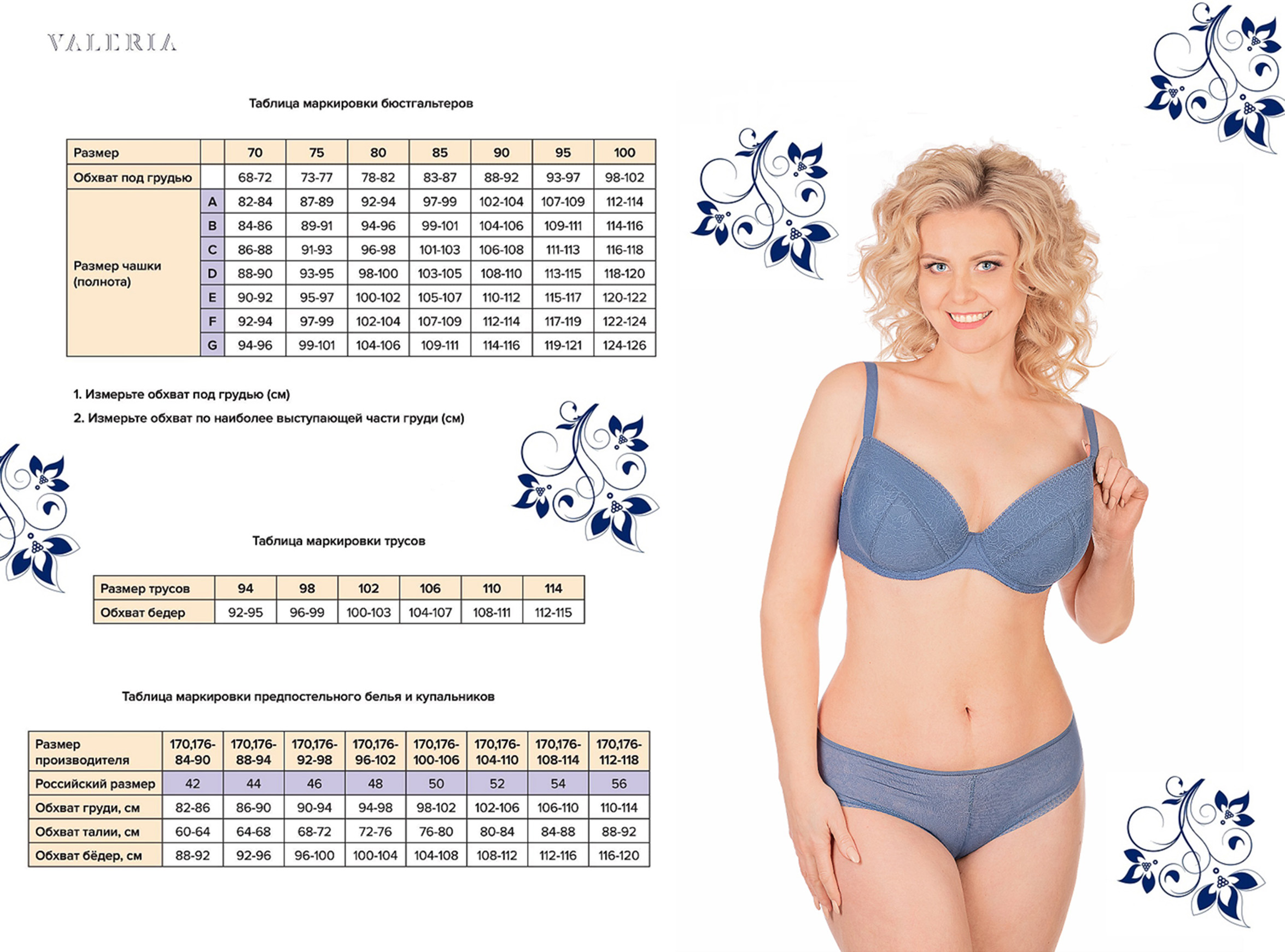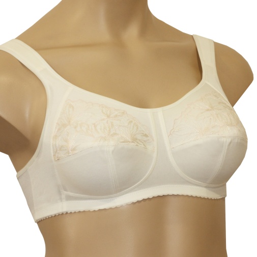 Бюстгальтер для фиксации протеза молочной железы из вышитого кружева на неэластичной сетке, трикотажного полотна, эластичного полотна с блеском, эластичного полотна, с втачными карманами для протеза из х/б трикотажного полотна. Чашка мягкая. Пояс с застежкой сзади на 2-4 крючка. Бретель широкая, на дубляже с хлопком, с регулировкой длины сзади.