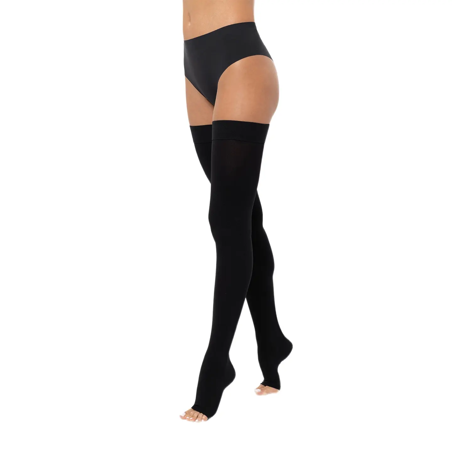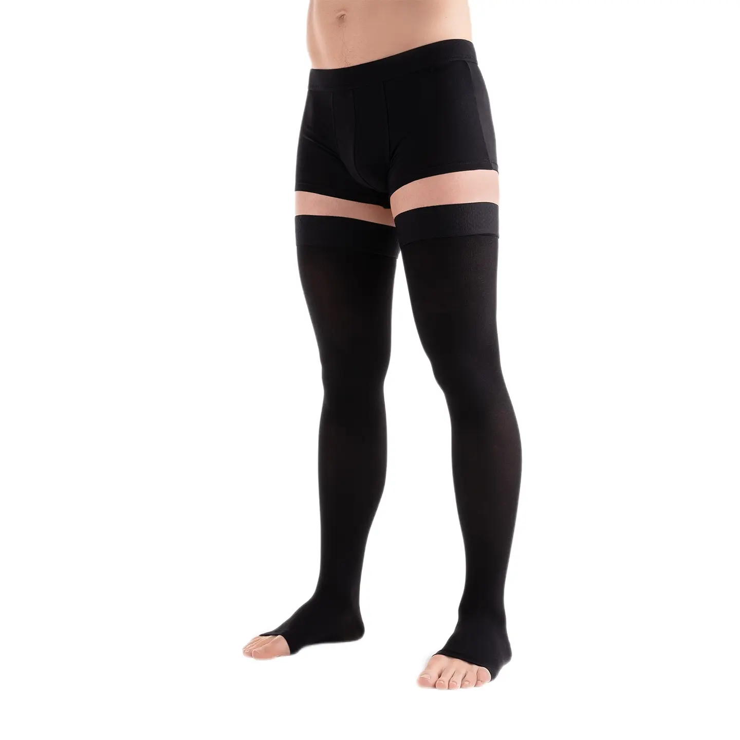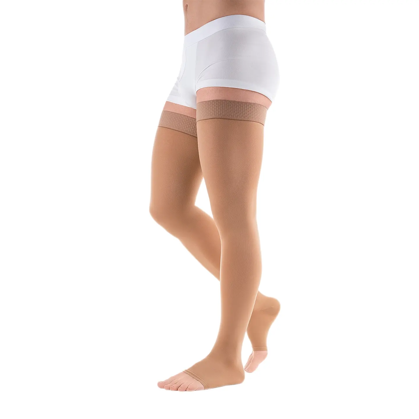 Компрессионные чулки с открытым носком ИНТЕКС 1 степени компрессии отлично подойдут людям имеющим деформацию пальцев стоп, повышенную потливость, обувь с открытым мысом. Чулки без носка сделаны по всем требованиям к изготовлению компрессионных изделий, где максимальное давление создано в области лодыжек и ослабевает по направлению к бедру. Такое распределение компрессии улучшает циркуляцию крови, предотвращая отеки и развитие варикоза. Эластичные чулки 1 компрессии имеют силиконовую резинку для удержания чулка на бедре. Точечное нанесение силикона на гладкую поверхность чулка без носка обеспечивает комфортное использование, как женщинам, так и мужчинам, не препятствуя кровотоку.