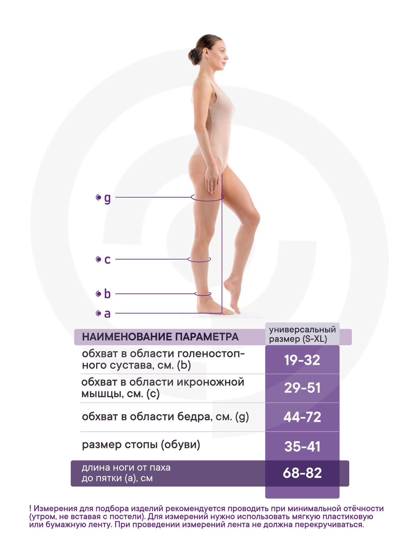 Назначение: для проведения компрессионной терапии при лечении заболеваний, связанных с образованием отёков, обусловленных сосудистой патологией нижних конечностей, а также для профилактики варикозного расширения вен и нормализации кровообращения в области конечностей, в том числе при длительных статических нагрузках, во время авиаперелётов и в период беременности.