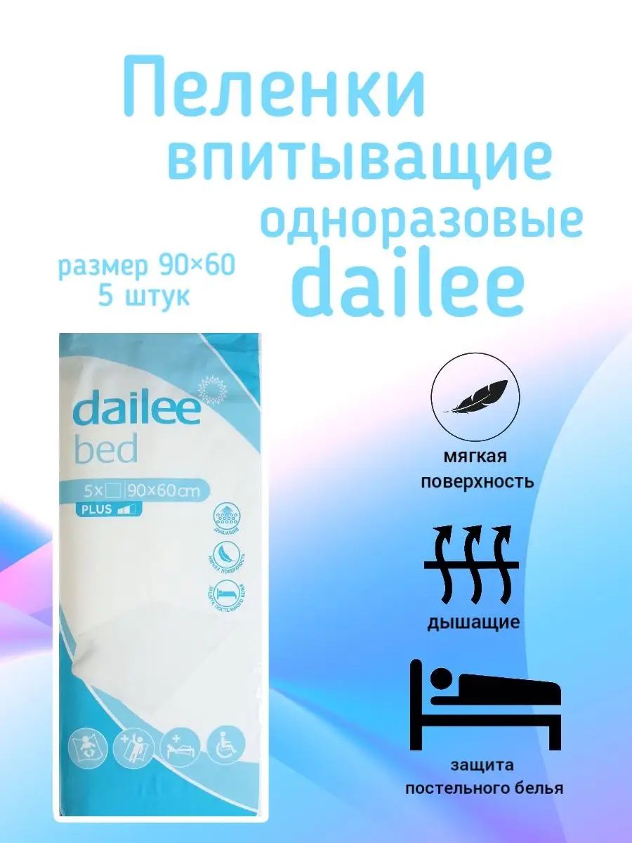 - Dailee пеленки - впитывающие одноразовые пеленки для ухода за лежачими больными размером 60х90 см. Упаковка включает в себя 5 штук. Изготовлены из мягкого и приятного на ощупь материала. Отлично впитывают жидкость, что обеспечивает сухость кожи и комфорт пациентам. Дейли пеленки подходят для использования в домашних условиях, в больницах и лечебных учреждениях.